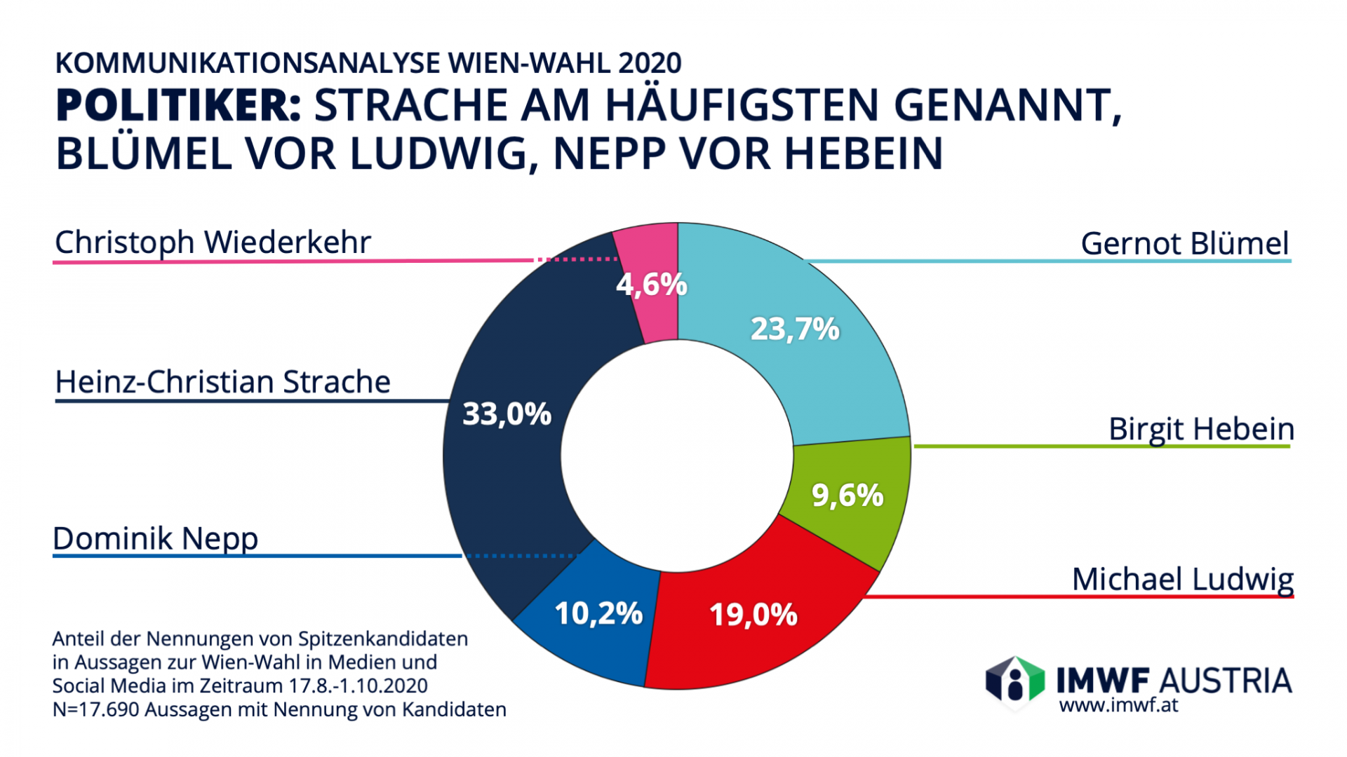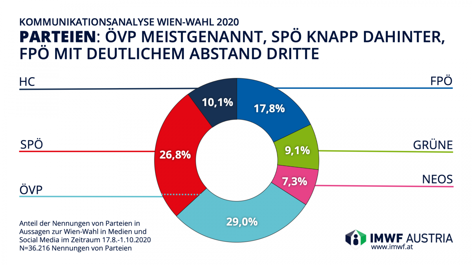 Den größten Anteil am öffentlichen Diskurs zur Wien-Wahl erzielt bisher mit 29 Prozent die ÖVP. Die SPÖ folgt mit 26,8 Prozent. Dahinter liegt die FPÖ mit 17,8 Prozent – deutlich vor Team HC-Strache, deren Spitzenkandidat Heinz-Christian Strache mit 33 Prozent Anteil der eindeutig meistgenannte Spitzenkandidat ist. Bei den Spitzenkandidaten folgen Gernot Blümel (23,7 Prozent) und Michael Ludwig (19 Prozent). FPÖ-Vormann Dominik Nepp kommt auf einen Anteil an Nennungen von 10,2 Prozent. Als einzige Spitzenkandidatin neben Strache übertrifft Vizebürgermeisterin Birgit Hebein ihre Partei, wenn auch nur knapp. Sie kommt auf 9,6 Prozent Anteil an den Diskussionen, die Grünen auf 9,1 Prozent. Die NEOS verzeichnen 7,3 Prozent, deren Spitzenkandidat Christoph Wiederkehr 4,6 Prozent.