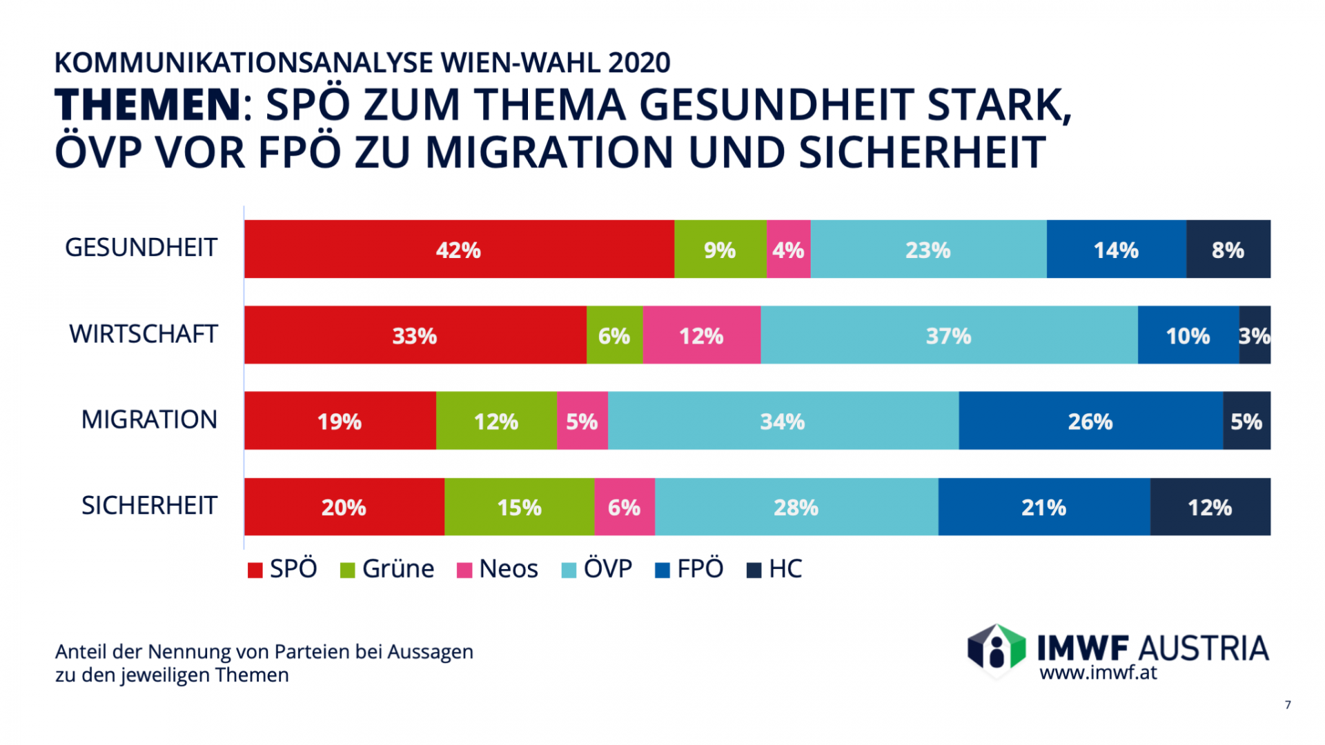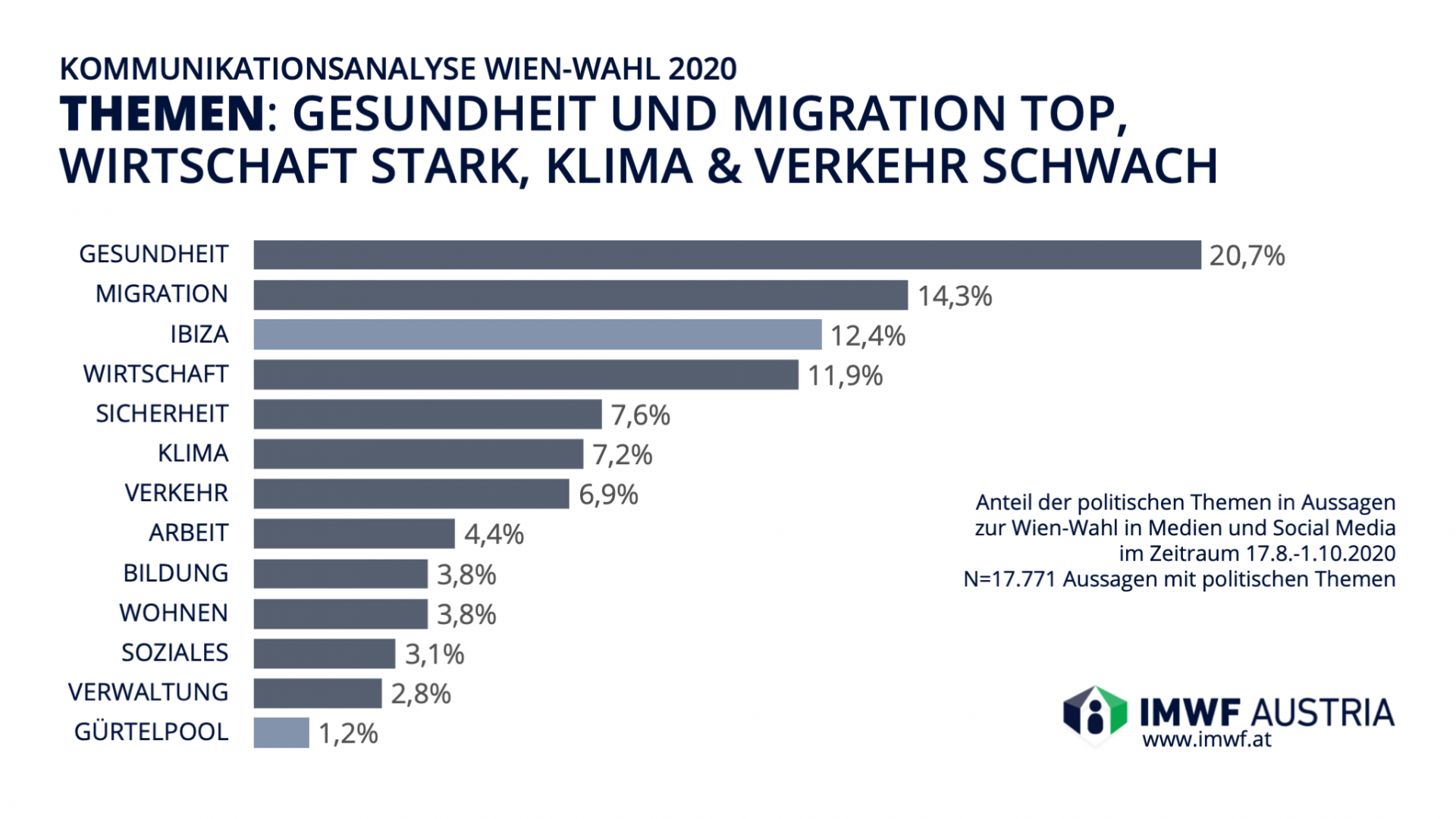 Die in der medialen Berichterstattung als sehr stark wahrgenommenen Themen wie Sicherheit, Klimaschutz und Verkehr spielen in der Wahlauseinandersetzung bisher eine eher untergeordnete Rolle. Sicherheit liegt mit einem Anteil von 7,6 Prozent dabei knapp vor Klima (7,2 Prozent) und Verkehr (6,9 Prozent). Bildung, Wohnen (je 3,8 Prozent) und Soziales (3,1 Prozent) finden in der öffentlichen Debatte zur Wiener Wahl nur am Rande statt.