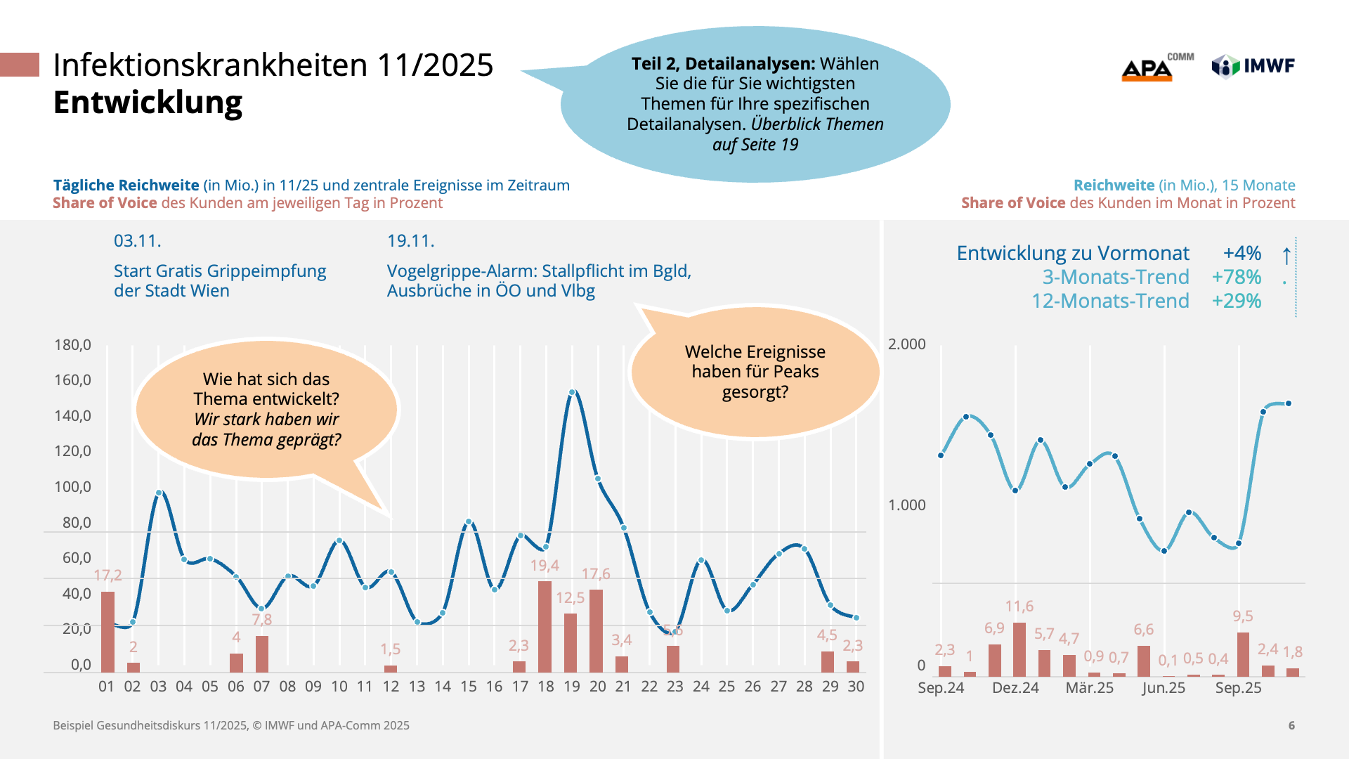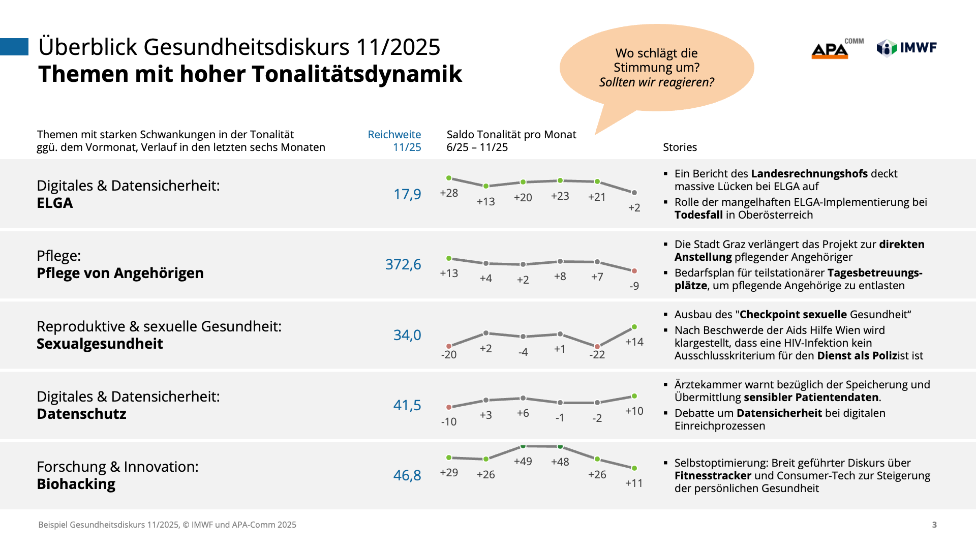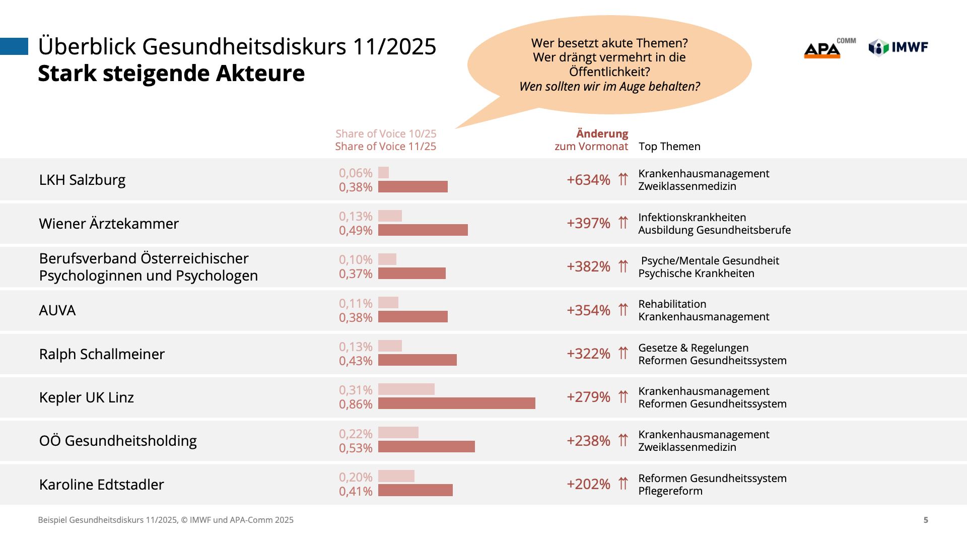 Machen Sie die Dynamik des Gesundheitswesens zu Ihrem strategischen Vorteil und steuern Sie Ihre Kommunikation auf Basis präziser Daten statt vager Vermutungen. Gemeinsam mit den Experten von IMWF Austria und APA-Comm bringen wir die Relevanz Ihrer Themen und Akteure punktgenau auf den Schirm.