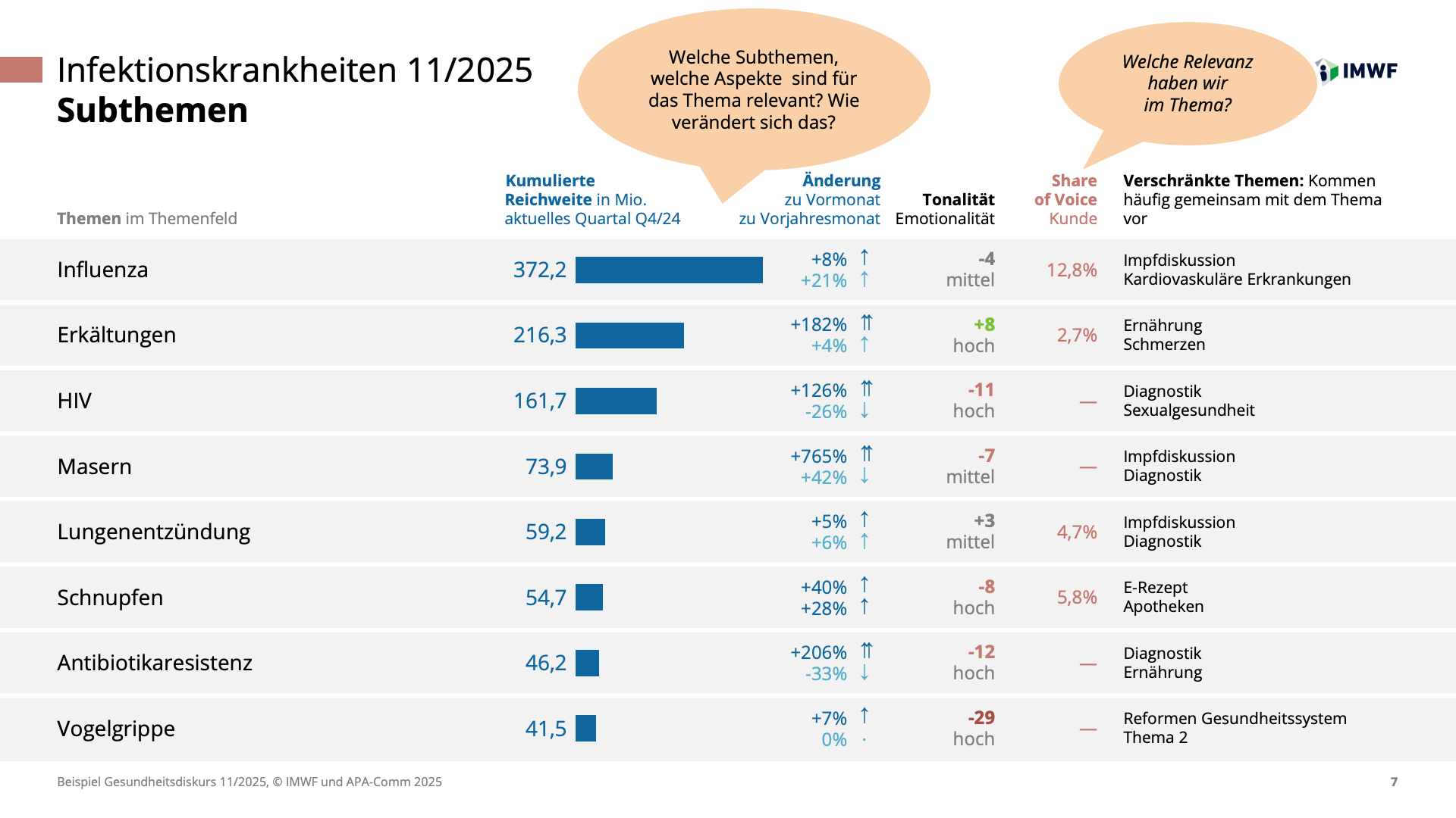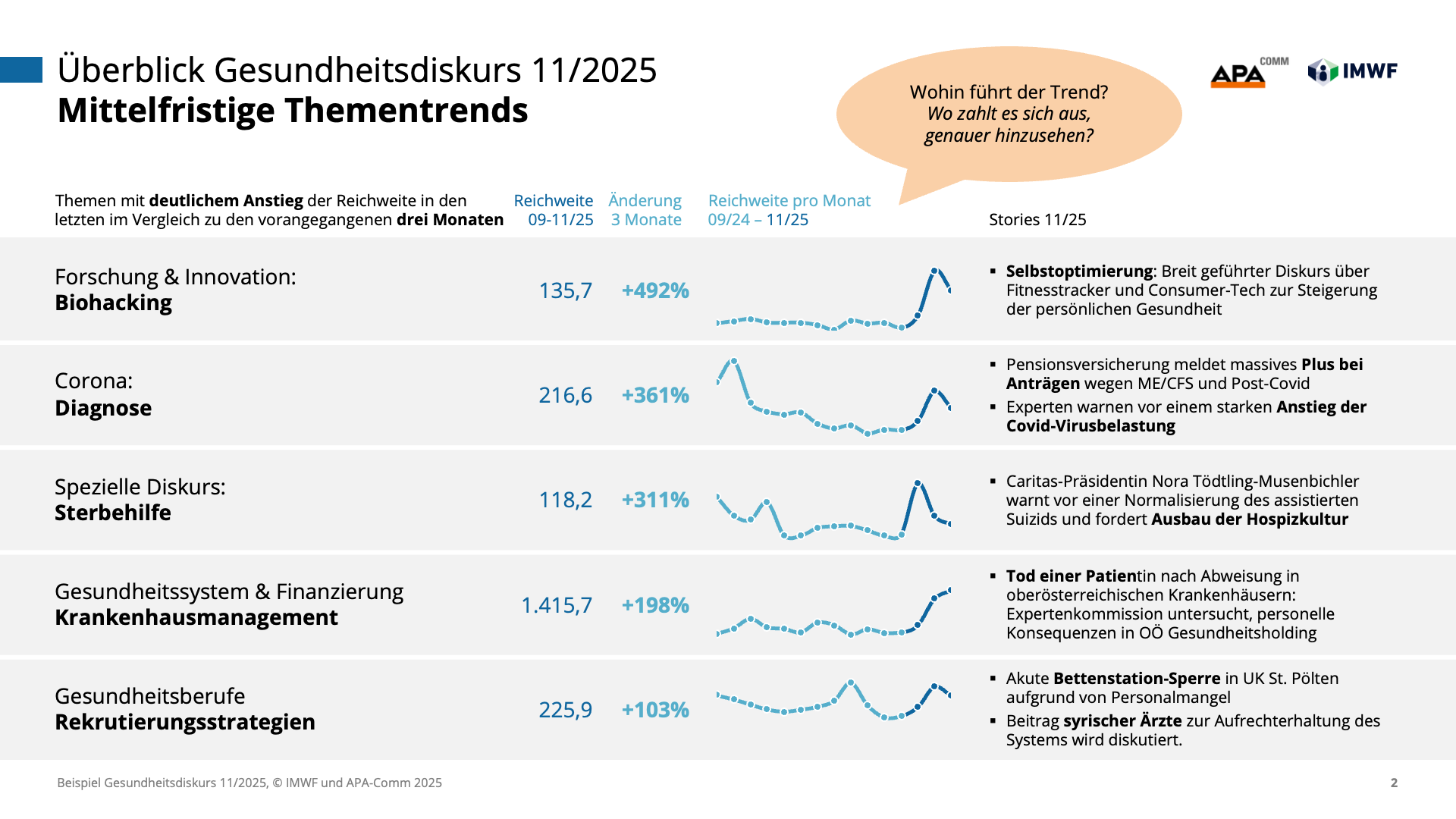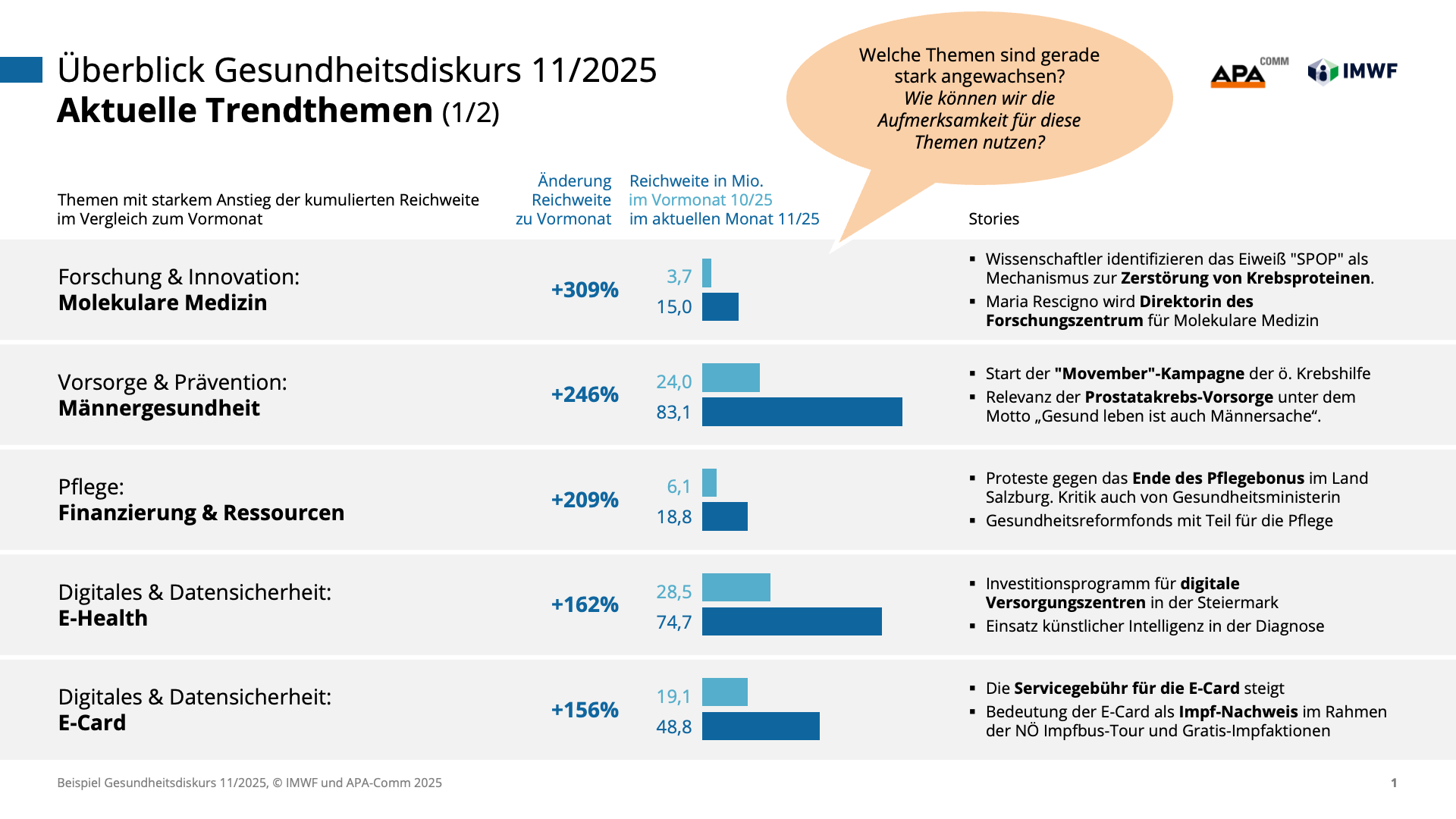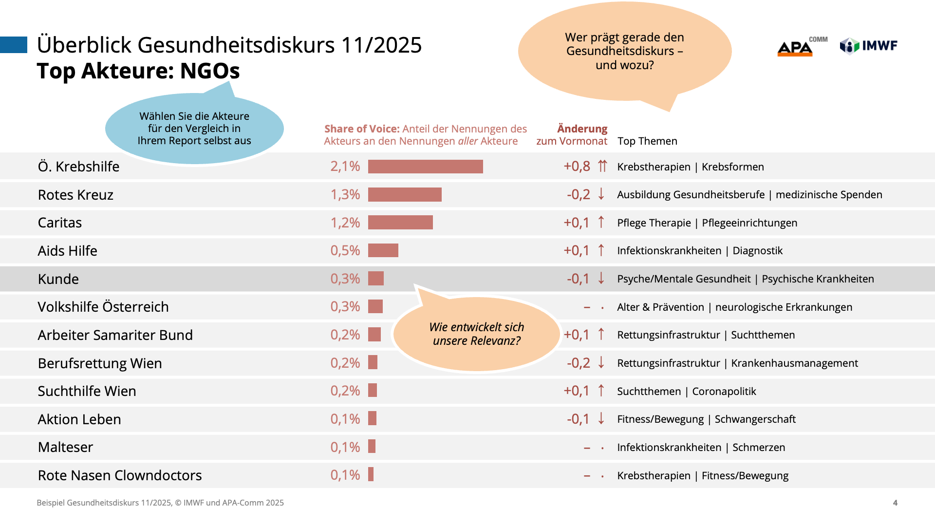 Machen Sie die Dynamik des Gesundheitswesens zu Ihrem strategischen Vorteil und steuern Sie Ihre Kommunikation auf Basis präziser Daten statt vager Vermutungen. Gemeinsam mit den Experten von IMWF Austria und APA-Comm bringen wir die Relevanz Ihrer Themen und Akteure punktgenau auf den Schirm.