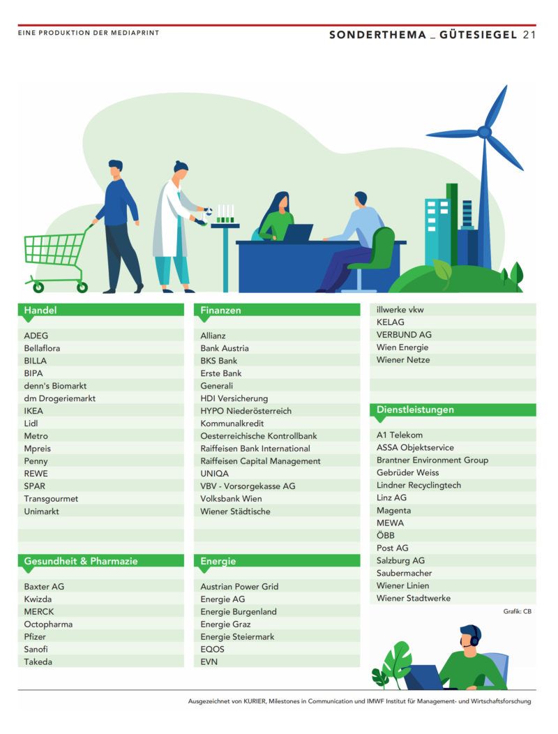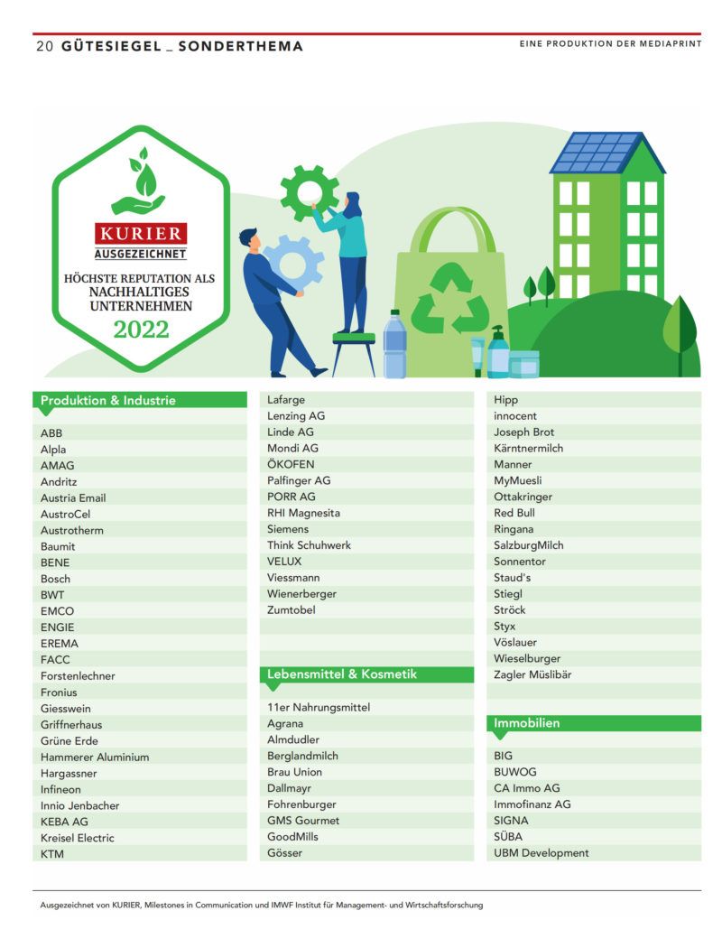 Gemeinsam mit dem KURIER kürt das IMWF die österreichischen Unternehmen mit der höchsten Reputation in der Nachhaltigkeit auf Basis einer umfassenden Studie.