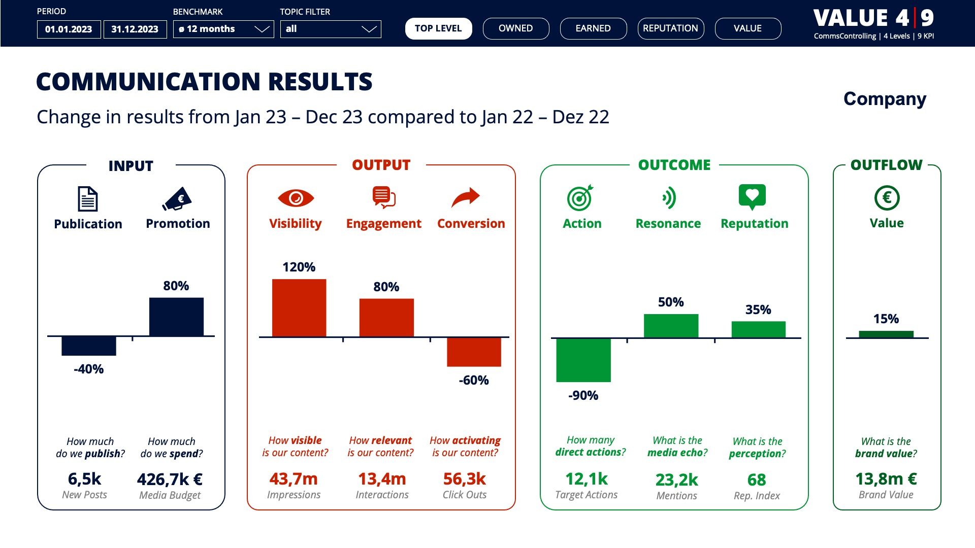 Dabei werden die wesentlichsten Metriken der Kommunikations-Performance über alle Wirkstufen hinweg gemessen: Vom Input der Kommunikationsabteilungen (Publikationen, Media Budget), über den unmittelbaren Output (Visibility, Engegement, Conversion), zum Outcome in Earned Media und Unternehmensreputation, bis zum Outflow – der monetären Leistung der Kommunikation für den Unternehmenserfolg (Brand Value).